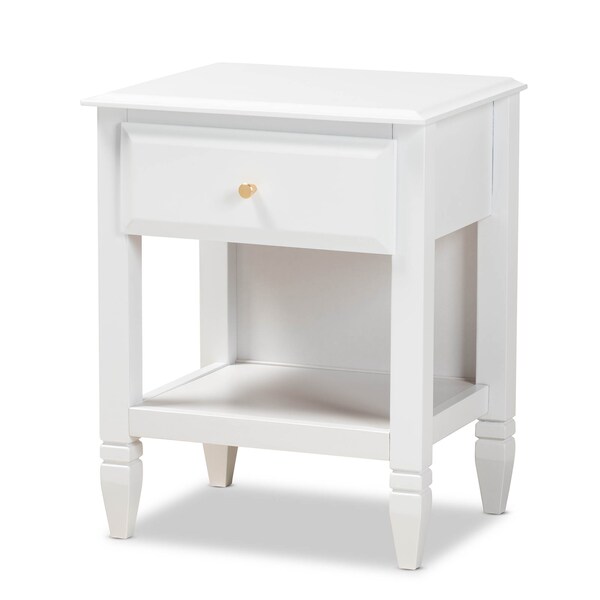 A classic silhouette receives a glamorous update in the Naomi nightstand. This wooden nightstand displays a polished white finish that brightens any space. The tabletop is well suited for a lamp and trinkets, while one drawer and one shelf provide storage space for bedside essentials. A striking gold-tone knob adds a touch of glamour. Inspired by traditional design, the Naomi features tapered feet with recessed detailing. Requiring assembly, the Naomi nightstand strikes the optimal balance between classic and contemporary for a look that enhances any bedroom.