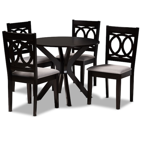 Contemporary design and superb comfort create the stunning Sanne dining set. The Sanne includes four dining chairs and one table constructed from sturdy wood in a rich dark brown finish. Each chair is fitted with a foam-padded cushion upholstered in smooth grey fabric and features a unique cut-out design on its back. Requiring assembly, the circular tabletop allows ample elbow room for each member of the table. Ideal for both casual and formal occasions, the Sanne dining set easily modernizes any dining space.