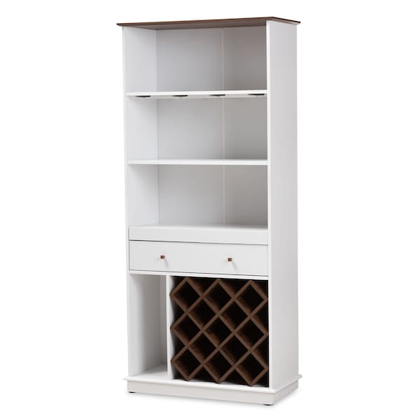 Featuring a built-in wine rack and glass holder, the Mattia wine cabinet is essential for any wine connoisseur. The Mattia is constructed from engineered wood for durability and displays a sleek, neutral finish. The cabinet features a built-in wine rack with space to store up to thirteen bottles of wine. Four open shelves provide additional storage space, with one of the shelves containing a stemware rack that can hold up to eight wine glasses. The cabinet is also fitted with a pull-out tray that makes it easy to prepare drinks. A large drawer beneath the tray contains storage for bottle openers, wine stoppers, and more. The Mattia wine cabinet requires assembly.