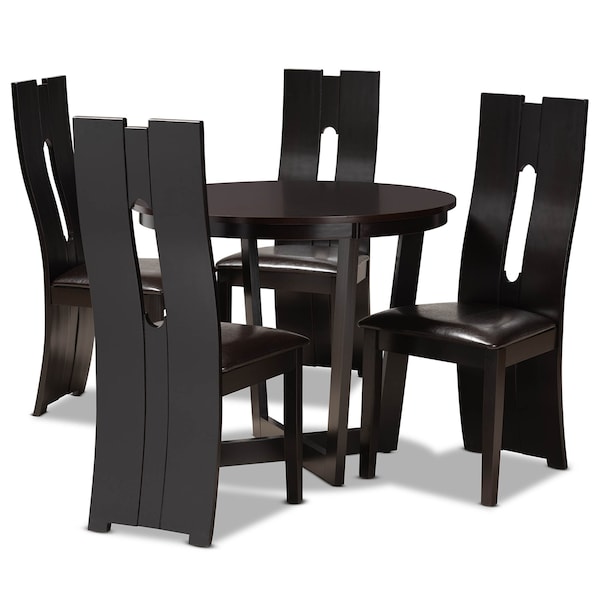 Exquisite attention to detail makes the Sorley dining set a distinctive addition to any space. This wooden set includes one table and four chairs, each upholstered in a sleek dark brown faux leather that matches the dark brown wood finish. Designed with both comfort and style in mind, each chair features a plush foam-padded seat, as well as a striking cut-out design on its back. The round tabletop is supported by an intersecting base, creating a chic, sculptural effect. Requiring assembly, the Sorley dining set is well suited for both casual and formal dining.