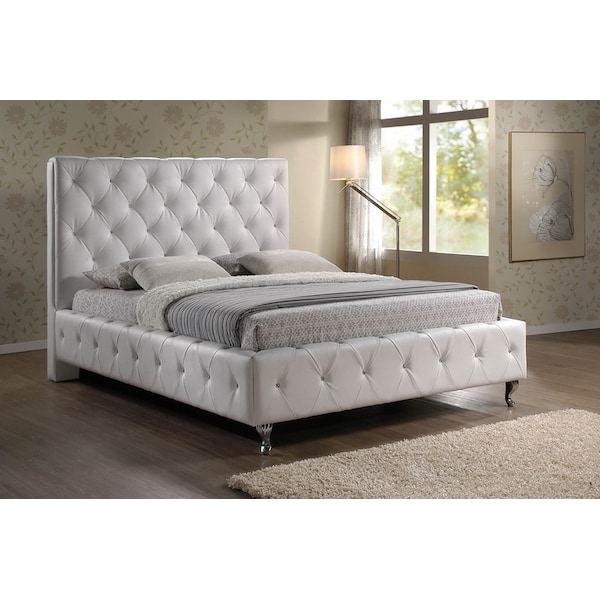 Stella is a glamorous designer platform bed that takes it up a notch with allover faux crystal button tufting. Dozens of crystal lookalike buttons adorn every nook and cranny and truly glimmer with even the slightest bit of light. A white faux leather king upholstered headboard, side rails, and footboard are finished with two chrome-plated metal legs at the foot of the bed. This modern bed is built with a wooden frame, which is padded with foam before being upholstered. Seeing that this is a platform bed, only a mattress is required: wooden slats (included) serve as a box spring. This bed, which requires assembly, is also available in queen in both white and black and has a matching Stella floor mirror and end of bed bench (sold separately). To clean, wipe with a damp cloth. Product dimension: 84"Wx90.5"Dx56"H , Internal size: 77"Wx81"D Side rail: 84"Wx3.5"Dx17.5"H Headboard: 84"Wx5.5"Dx55.75"H Footboard: 84"Wx3.5"Dx17.5"H Height to top of slat:13.25" Height of legs: 5.75"