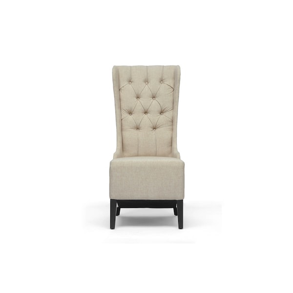 Traditional button tufting and neutral beige linen upholstery paired with a unique extra tall backrest make this otherwise classic design a modern force to be reckoned with! The resulting style screams luxury and designer inspiration but without the unapproachable price tag. The modern accent chair, which befits a classy lounge or living room alike, is built on a birch wood frame with black legs and foam cushioning. The fully assembled Vincent Chair should be spot cleaned. A matching loveseat is also available (sold separately). product dimension:21.25"Wx23"Dx47.25"H , seat dimension:21.25"Wx18"Dx20"H