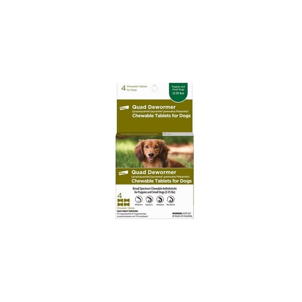 Chewable Quad Dewormer for Small Dogs, 2-25 lbs, 4 chewable tablets. Quad Dewormer treats roundworms, hookworms, tapeworms and whipworms in dogs over 4 weeks old.
