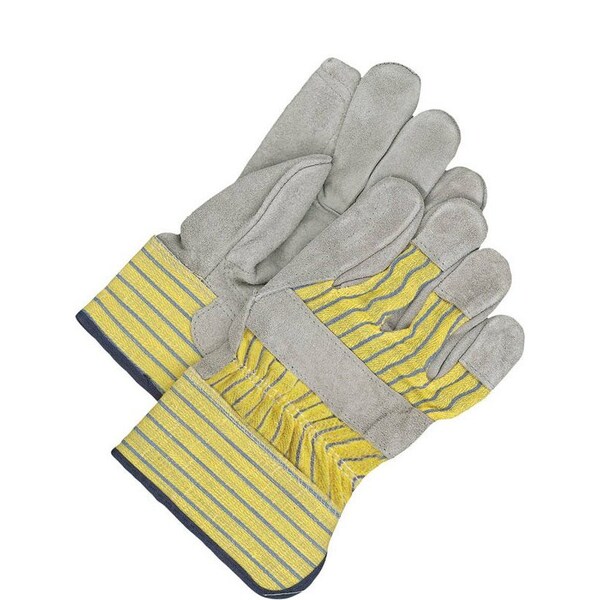 Split cowhide palm, index finger & fingertips; Cotton backhand with split leather knuckle strap; Fleece palm lining; Rubberized safety cuff; Inside elastic wrist; Gunn cut with wing thumb; Inside double palm