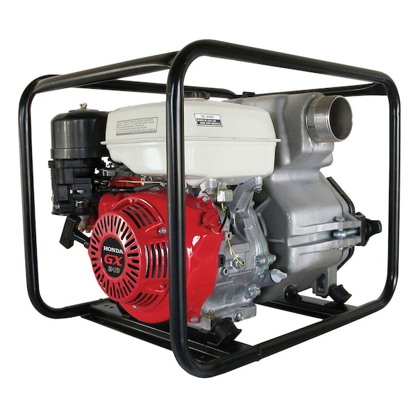 Includes a Honda GX240 Oil Alert engine and Centrifugal Aluminum pump. Made using durable tubular steel framing with black powder coat finish for strength and safety. Max suction head of 26'. Trash Pumps with 3 and 4 intake can pump out solid materials up to 1 diameter.