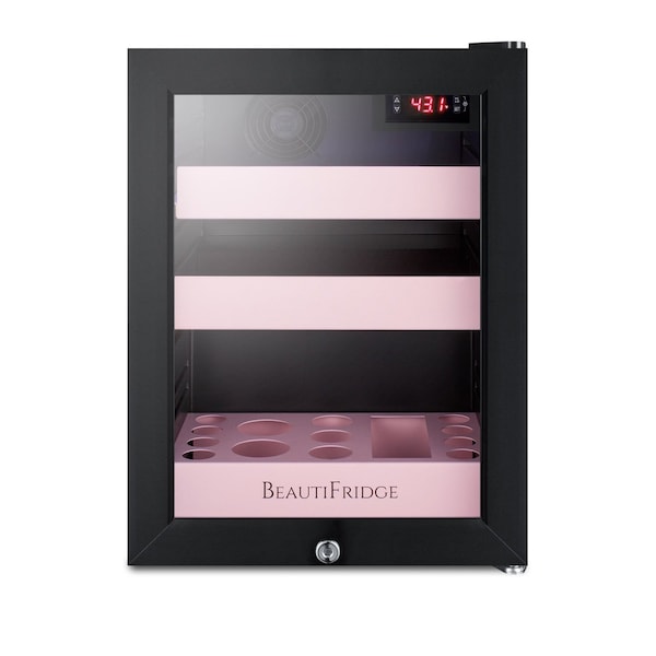 BeautiFridge by Summit Appliance presents a unique selection of compact coolers designed and constructed for the reliable storage and display of cosmetics. The LX114LR is a compact cooler ideal for keeping beauty products under the proper conditions. It comes in a jet black cabinet finish with a user-reversible double pane tempered glass door. Powerful but energy efficient LED lighting provides an attractive view of the black interior, while a factory-installed lock offers added security. A sealed back saves space and makes for easy cleaning of the unit. Inside, the LX114LR utilizes a commercial-grade compressor that helps to ensure rapid temperature recovery for better performance. Fan-forced cooling affords even temperature distribution within the unit, while an automatic defrost operation means minimal user maintenance. The digital thermostat is located inside, with a specialized range of 42 Degrees F to 65 Degrees F to keep makeup and facial creams properly cooled. For convenient storage, all BeautiFridge coolers include two adjustable metal shelves that can easily be removed to serve as trays for your cosmetics. We also include a third shelf designed to sit on the unit's floor, with multiple round and square cutouts ideal for the upright storage of creams, serums, and similar cosmetics typically packaged in bottle form. The LX114LR comes with shelving in a matte blush finish. Additional colors are available, as well as BeautiFridges with mirror-tinted doors. Visit www.summitappliance.com/beautifridge to view additional options. With its user-friendly features designed to attractively store and display cosmetics, the BeautiFridge is the perfect addition to any home vanity, bathroom, or similar space.