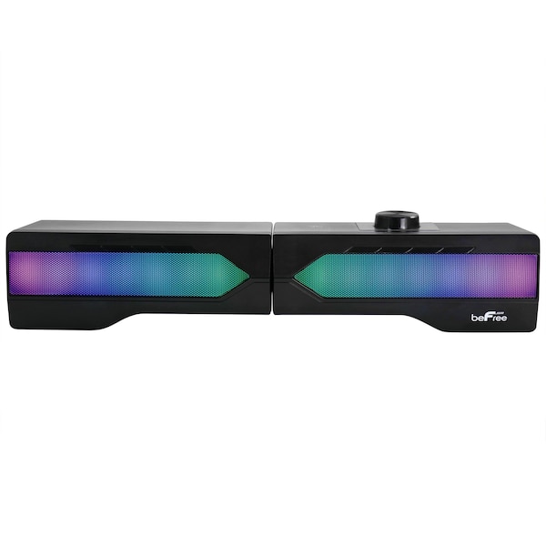 Immerse yourself into gameplay with the beFree Sound Gaming Soundbar. With powerful sound quality suited for gaming and vibrant color changing LED lights, you will experience your gaming on a whole new level. This sound bar is designed to come apart into two pieces for convenience, when you want a more surround sound experience or need to make space, just separate the two halves and stand up individually! Compact size is perfect for any desk top gaming set up. Rotary volume knob and touch shut off function gives you full control of light and sound. Power connection is a dual AUX and USB cable for easy hook up to both desktop and laptop computers.