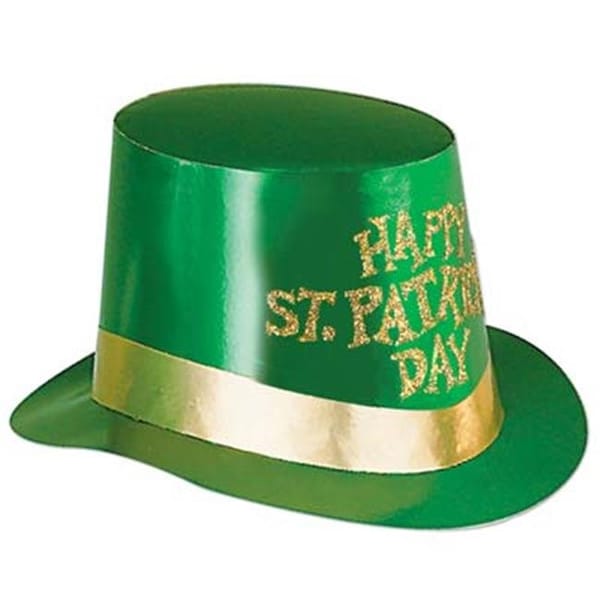 With gold glitter & bandOne size fits mostTheme: St. Patrick'sHats & Glittered Foil 677821
