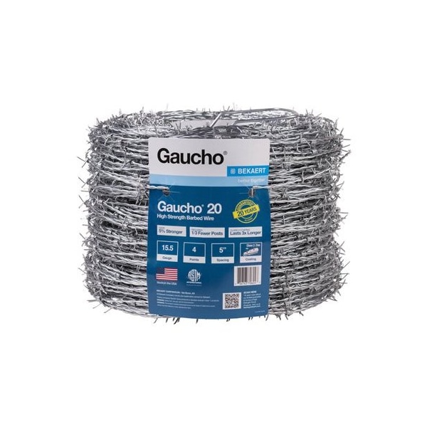 Gaucho 20, 1,320', High Strength Barbed Wire, 155G, 4 Point, 5 Spacing, Class 3 , Made Of High Strength Steel Wire, Can Use A Smaller Diameter Wire While Maintaining The Same Strength As Standard Strength Barbed Wire, Reverse Twist Design Reduces Sagging, Eliminates The Need For PreStretching Allows For Increased Post Spacing, All Of Which Will Save You Time, Money Maintenance Headaches, Great For Cattle Exclusion Purposes