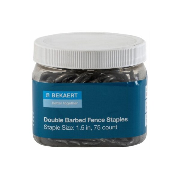 Bekaert, 75 count, 15 in long fence staples, 8 gauge, bezinal coating Double barbs to hold securely in the post and have sharp right hand cut tips for easy driving Packed in a sturdy 75 count tub with 20 tubs in a case