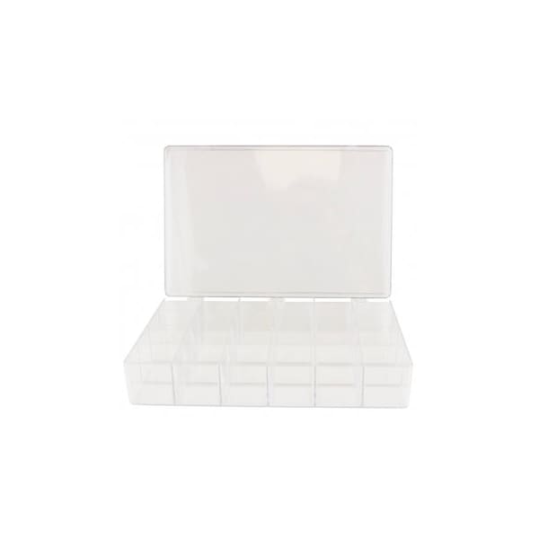 Crystal-clear, styrene plastic affords full visibility of contents. A tight fitting, hinged lid keeps objects contained. Helps keep your workspace organized more efficient.