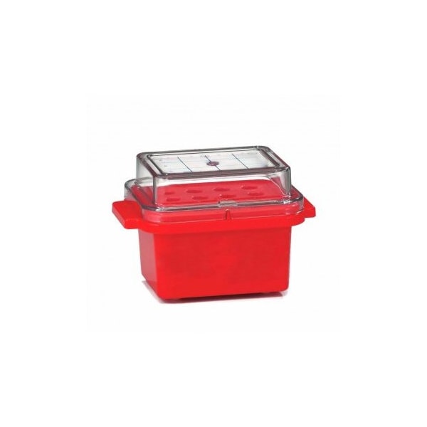 Bench top sized cooler holds twelve 0.5 or 1.5ml microcentrifuge tubes at a temperature below 0oC for approximately 2 1/2 hours. Ideal for protecting valuable samples stored in a freezer with defrost cycle. Use included insert to hold 0.5 ml microcentrifuge tubes. Store at -20oC for a few hours until the temperature of the cooler falls below 0oC. Polycarbonate cooler body is filled with a non-toxic gel which cannot contact tubes; ensures markings and labels on tubes are safe. A clear polycarbonate lid shows positions of tubes; keyed to correspond with positions printed on cooler. Molded side handles allow secure grip for transfer. Rubber feet to prevent sliding on the lab bench and coolers are stackable.WARNING This product can expose you to chemicals including Bisphenol-A, which is known to the State of California to cause cancer or birth defects or other reproductive harm. For more information go to www.P65Warnings.ca.gov.