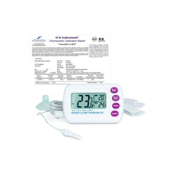 Digital thermometers that effectively measure the temperature of wet or dry environments including freezers, refrigerators, water baths, aquariums, incubators and more. features available include minimum/maximum temperature readings, dual/triple display, and alarms all models include accredited calibration documentation that meets the requirements of iso 17025 tested and calibrated in h-b's exclusive triple accredited/registered iso/iec 17025:2017, a2la accredited laboratory cert #2448.01, against equipment whose calibration is traceable to nist includes multi-language instructions english, french, german, italian, portuguese, and spanish individually serialized, ce marked