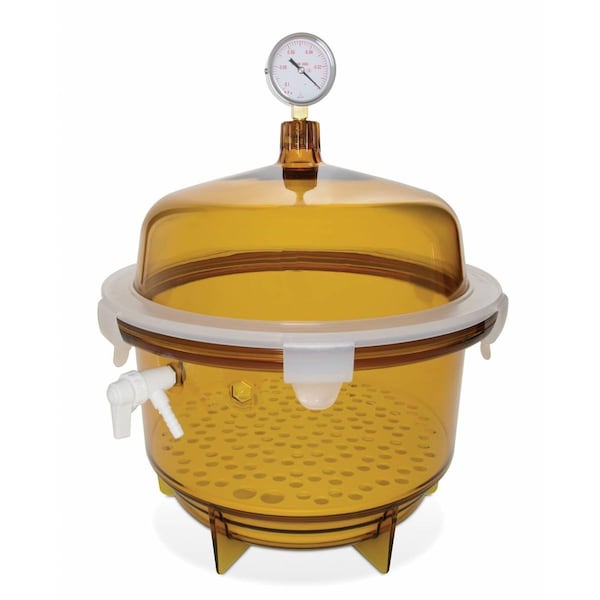 These high-quality vacuum desiccators stay gastight allowing reliable dry storage or experiments over extended periods. Able to maintain 29in.-Hg vacuum for over 72 hours at room temperature, they provide vacuum integrity resulting in lower maintenance and greater peace of mind. Viton 3-way valve offers consistent and uniform vacuum draw, vacuum release, or gas exchange Vacuum level checking is simplified with a built-in analog vacuum gauge at the top of the unit High-quality silicone O-ring and specially designed locking ring allow outstanding vacuum capability with virtually no leakage Amber tinted UV blocking models block 100% of UVA, B, and C light to minimize damages or discoloration of light-sensitive samples Locking ring secures top and bottom halves when vacuum not in use; provides additional convenience and safety when moving the unit Includes desiccant tray Use with any vacuum with free air capacity of 1.5 cubic feet per minute (CFM) or greaterWARNING This product can expose you to chemicals including Lead and Bisphenol-A , which is known to the State of California to cause cancer or birth defects or other reproductive harm. For more information go to www.P65Warnings.ca.gov.