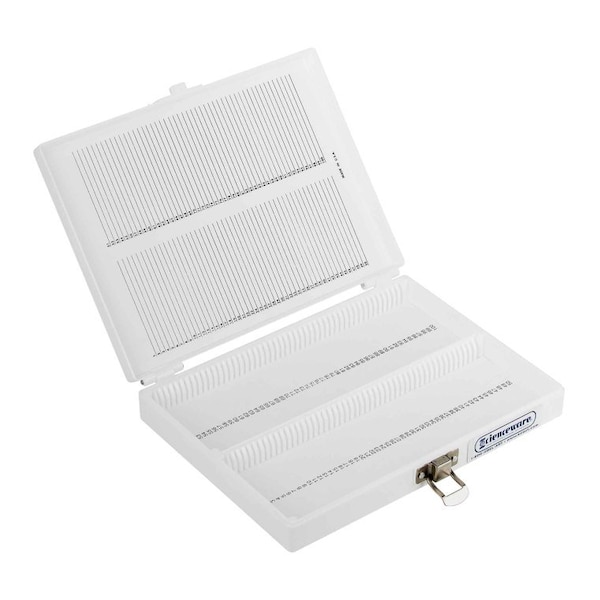 Slide Box for 100 Slides with Hinged Lid Supreme defense for standard 25 x 75mm 1'' x 3'' microscope slides. Features: Heavy-walled, moisture- and insect-proof Slim, durable design Easily identify slides with included numbered index on base and cover Box walls are rugged and won't bend, split, or chipStorage box for holding microscope slides securelyHolds 25 x 75mm 1 x 3'' microscope slides sold separatelyNumbered slide positions and content sheet for listing slidesPolystyrene box construction for durability