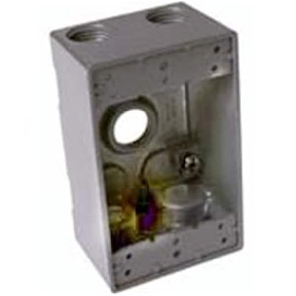Features With lugs. Die cast aluminum. For use in branch circuit wiring in wet, damp, or dry locations. May be used as a weatherproof junction box, or as housing for receptacles, switches, and GFCIs. 5 reinforced 1/2 in. threaded connector outlets. Powder coat finish. Two closure plugs included. Ground screws installed. Internal threads and hubs comply with NEMA requirements. 18.3 cubic inch capacity. Deep - 2 in. 5 Outlets. Material - Aluminum. Color - Gray. Dimension - 16.19 x 6.5 x 8.5 in. Item Weight - .63 lbs.