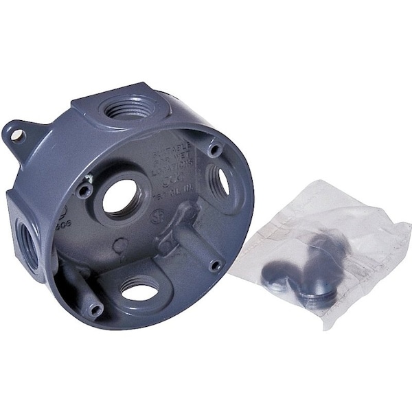 For use in branch circuit wiring in wet, damp or dry locations Designed for use as a weatherproof junction box and used with BELL round cluster covers and round lamp holder combinations Diecast aluminum construction Powder coat finish Reinforced connector outlets Castin mounting lugs, four closure plugs included and installed ground screw 161 cuin capacity Six 1024 tapped holes 4 in Dia x 112 in D UL listed