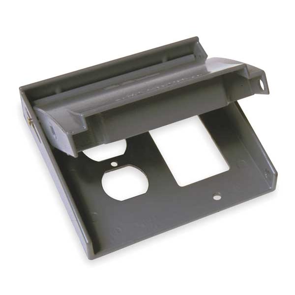 Weatherproof Cover, Mounting Box FS or FD Weatherproof Boxes, For Use With Outdoor Receptacles, Mounting Orientation Vertical, Lid Style Self Closing, Number of Gangs 2, Gasket Material Neoprene, Cover Material Die-Cast Zinc, Color Gray, Height 4 9/16 in, Width 4 5/8 in, Depth 1 3/16 in, NEMA Rating 3R, Standards cULus, NEC, Includes Gasket, Installation Hardware