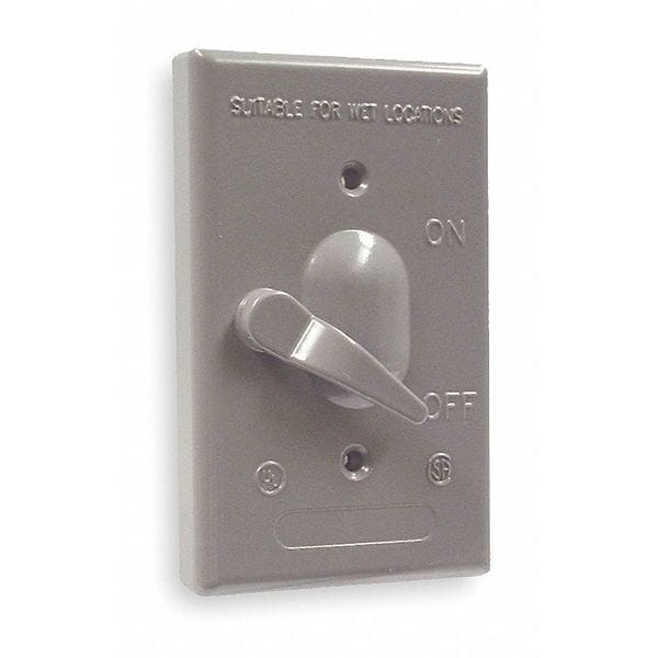Weatherproof Cover, Mounting Box FS or FD Weatherproof Boxes, For Use With Outdoor On-Off Toggle Switches, Mounting Orientation Vertical, Lid Style No Lid, Number of Gangs 1, Gasket Material Neoprene, Cover Material Die-Cast Zinc, Color Gray, Height 4 1/2 in, Width 2 3/4 in, Depth 1 9/16 in, NEMA Rating 3R, Standards CSA, UL Listed, Includes Gasket, Installation Hardware