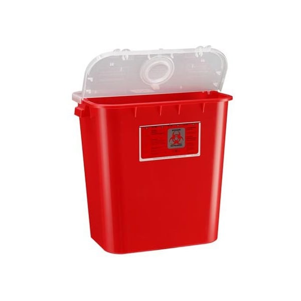 Designed for use in research labs, patient rooms, physicians' offices, clinics and other high-traffic areas. Hinged lid accommodates large items and horizontal drop allows maximum capacity of sharps. The translucent containers and lids help identify fill level. Sharps-Tainers lock for final disposal and can accommodate syringes up to 60cc. Multilingual labeling ensures user safety. Container can be autoclaved or incinerated for final disposal. Dimensions inches: 16 1/2 x 11 13/16 x 15 7/8 H Separate round opening accepts small items Hinged lid accommodates large items Built-in handles for easy transport For single use only Non-toxic, latex-free and heavy metal freeShipping Weight: 2.5501 lbsShipping Dimensions: 17.00 x 16.00 x 10.50Research or further manufacturing use only, not for food or drug use.