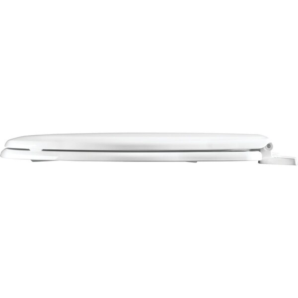 This round white toilet seat is made from plastic with a smooth finish. It has basic color-matched Top-Tite hinges for easy installation and color-matched bumpers. It fits all manufacturers round bowls is made with environmentally friendly materials and processes.