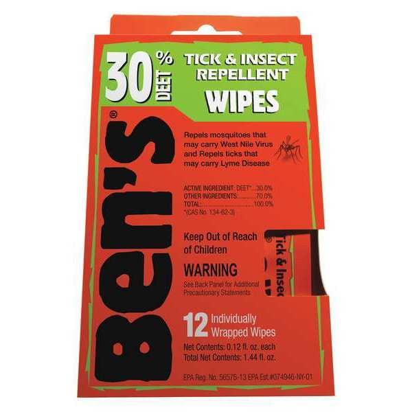 Insect Repellent, Targeted Insects Mosquitos, Ticks, Active Ingredients DEET, DEET Concentration 30.00 Percent, Form Wipes, Insect Group Flying and Crawling, Insect Control Type Repels, Package Quantity 12