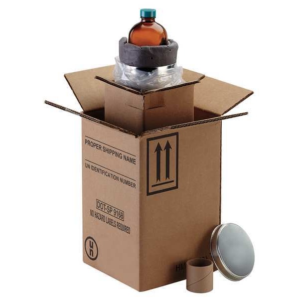 Hazardous Material Shipping Kit, Wall Type Double Wall, Inside Length 11 3/16 in, Inside Width 11 3/16 in, Inside Height 14 3/4 in, Inside LxWxH 11-3/16x11-3/16x14-3/4 in, UN Rating Solid 4GV/X4/S, Holds Container Style Bottle, Holds Container Size (1) 32 oz Bottle, Holds Number of Containers 1, Holds (1) 32 oz Bottle, Board Test 275#, Outside Length 11 1/2 in, Outside Width 11 1/2 in, Outside Height 15 1/8 in, Outside LxWxH 11-1/2x11-1/2x15-1/8 in, Material Corrugated Cardboard, Color Brown