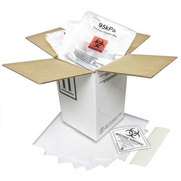 Hazardous Material Shipping Kit, Wall Type Single Wall, Inside Length 6 in, Inside Width 6 in, Inside Height 8 1/2 in, Inside LxWxH 6x6x8-1/2 in, Holds Container Style Bag, Holds Number of Containers 3, Holds (3) Glass or (15) Plastic Vials, Board Test 275#, Outside Length 8 11/16 in, Outside Width 6 1/16 in, Outside Height 6 1/16 in, Outside LxWxH 8-11/16x6-1/16x6-1/16 in, Material Corrugated Cardboard, Color White, Standards UN Rated, Package Quantity 12