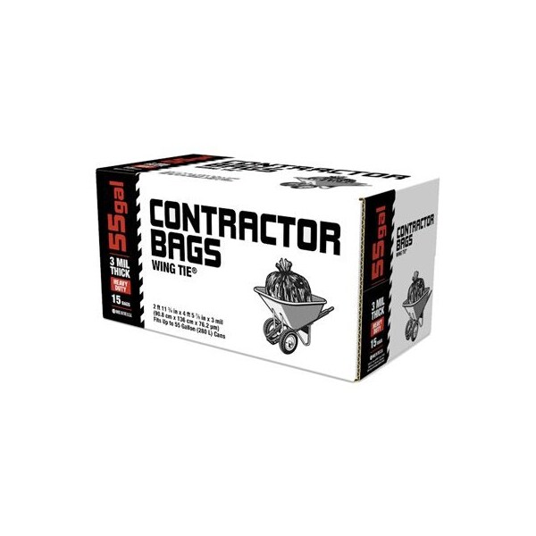 15 Count, 55 Gallon, 3 Mil, Black, Contractor Trash Bag, Wing Tie, 35 x 53, Boxed