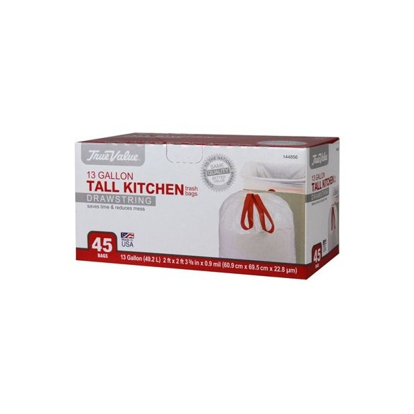 True Value, 45 Count, 13 Gallon, 9 Mil, White, Tall Kitchen Trash Bag, Drawstring, 24 x 27, Boxed