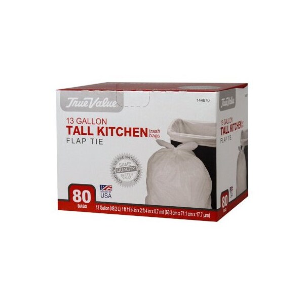 True Value, 80 Count, 13 Gallon, 7 Mil, White, Tall Kitchen Trash Bag, Wing Tie, 24 x 28, Boxed