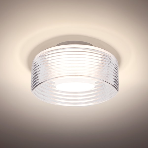 The Belu ceiling features a ribbed drum glass shade that adds a touch of elegance and sophistication to any space. The glass shade has horizontal ribbed detailing and a inner white acrylic shield, which creates a beautiful and distinctive visual effect when illuminated. These stylish and functional luminaries are offered in a beautiful Satin Nickel finish.