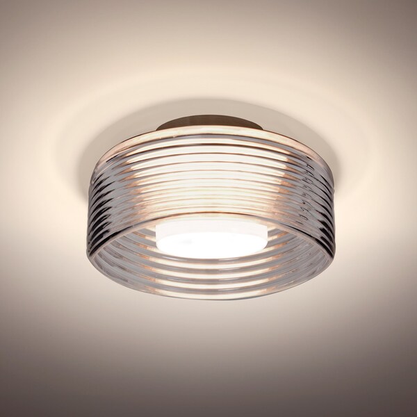 The Belu ceiling features a ribbed drum glass shade that adds a touch of elegance and sophistication to any space. The glass shade has horizontal ribbed detailing and a inner white acrylic shield, which creates a beautiful and distinctive visual effect when illuminated. These stylish and functional luminaries are offered in a beautiful brushed Bronze finish.