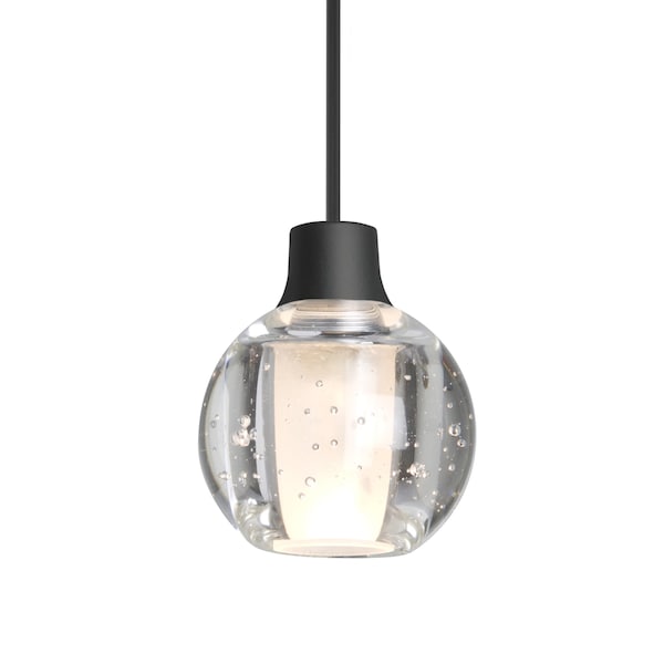 The Boca LED Mini Pendant is comprised of an appealing globe-shaped clear bubble-patterned solid glass, accented by an interesting inner frosted tube to diffuse the light source. The splash of concealed LED illumination through the solid glass shade's bubble accents makes the Boca 3 a stunning display of light refractions. The 12V cord pendant fixture is equipped with a 10ft braided coaxial cord with teflon jacket and a low profile flat monopoint canopy. These stylish and functional luminaries are offered in a beautiful Black finish.