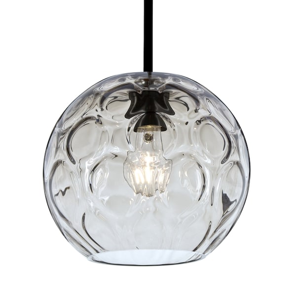 The Bombay Pendant is composed of a clear glass globe, with an interesting circular optical pattern blown throughout the interior of the glass. The dramatic play of light through the accents and onto adjacent surfaces make for a striking affect, along with the modest display of the lamp filament behind the glass. The stem pendant fixture is equipped with an adjustable telescoping section, 4 connectable stem sections 3in, 6in, 12in, and 18in and low Profile flat monopoint canopy. These stylish and functional luminaries are offered in a beautiful Black finish.