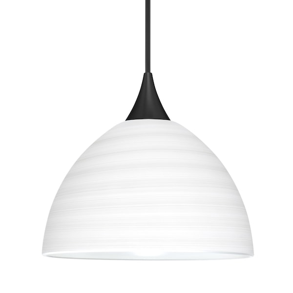 Brella has a classical bell shape that complements aesthetic, while also built for optimal illumination. Our Chalk glass is a soft white opal cased glass that is handcrafted with spiraling strokes of off-white color, emphasizing the subtle brush pattern. The silvery rippled design is subdued and harmonious. Unlit, it appears as simply a textured surface like spun silk, but when lit the texture comes alive. The smooth satin finish on the clear outer layer is a result of an extensive etching process, with the texture of the subtle brushing. This blown glass is handcrafted by a skilled artisan, utilizing century-old techniques passed down from generation to generation. The 12V cord pendant fixture is equipped with a 10ft braided coaxial cord with teflon jacket and a low profile flat monopoint canopy. These stylish and functional luminaries are offered in a beautiful Black finish.