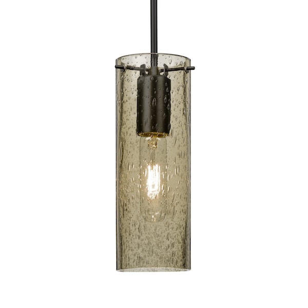 The Juni 10 Pendant is composed of a transparent Latte glass cylinder, with an interesting bubble pattern blown randomly throughout the glass. The pleasing play of light through the bubble accents make for a striking affect, along with the prominent display of the lamp filament behind the glass. The cord pendant fixture is equipped with a 10ft SVT cordset and a low profile flat monopoint canopy. These stylish and functional luminaries are offered in a beautiful Black finish.