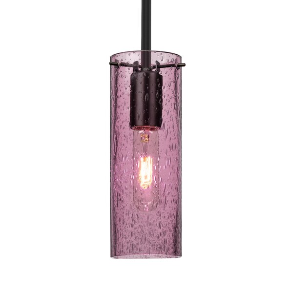 The Juni 10 Pendant is composed of a transparent Plum glass cylinder, with an interesting bubble pattern blown randomly throughout the glass. The pleasing play of light through the bubble accents make for a striking affect, along with the prominent display of the lamp filament behind the glass. The stem pendant fixture is equipped with an adjustable telescoping section, 4 connectable stem sections 3in, 6in, 12in, and 18in and low Profile flat monopoint canopy. These stylish and functional luminaries are offered in a beautiful Black finish.