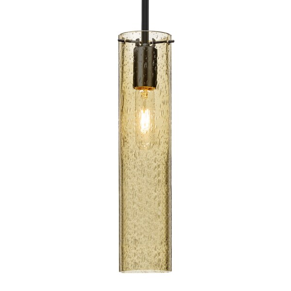 The Juni 16 Pendant is composed of a narrow transparent Gold glass cylinder, with an interesting bubble pattern blown randomly throughout the glass. The pleasing play of light through the bubble accents make for a striking affect, along with the prominent display of the lamp filament behind the glass. The stem pendant fixture is equipped with an adjustable telescoping section, 4 connectable stem sections 3in, 6in, 12in, and 18in and low Profile flat monopoint canopy. These stylish and functional luminaries are offered in a beautiful Black finish.
