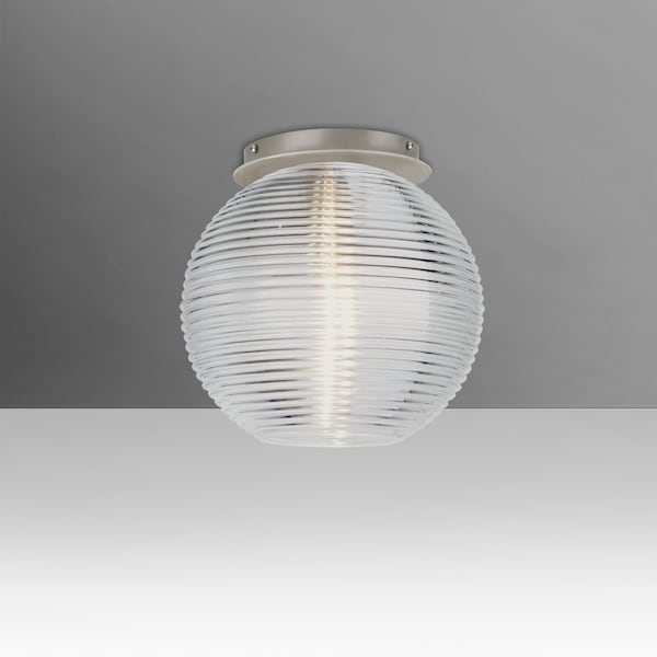 The Kristall is a transparent globe shape, with distinctive ridges, that fits gracefully into contemporary spaces. The clear blown glass is contemporary yet timeless, and will suit any classic or modern decor. When lit, the clear glass shimmers and sparkles with the accents from the light source. This blown glass combination is handcrafted by a skilled artisan, utilizing century-old techniques passed down from generation to generation. The semi-flush fixture is equipped with a socket on a low profile flat canopy, with machined and plated glassholder hardware. These stylish and functional luminaries are offered in a beautiful Satin Nickel finish.