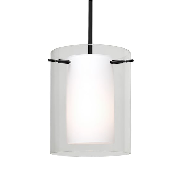 Pahu is a distinctive double-glass pendant, with an inner opal cylinder centered within a transparent outer glass The clear blown glass complements the soft white Opal cased glass, which can suit any classic or modern decor. Opal has a very tranquil glow that is pleasing in appearance, as the clear glass sparkles with the accents from that glow. The smooth satin finish on the opals outer layer is a result of an extensive etching process. This blown glass combination is handcrafted by a skilled artisan, utilizing century-old techniques passed down from generation to generation. The stem pendant fixture is equipped with an adjustable telescoping section, 4 connectable stem sections 3in, 6in, 12in, and 18in and low Profile flat monopoint canopy. These stylish and functional luminaries are offered in a beautiful Black finish.