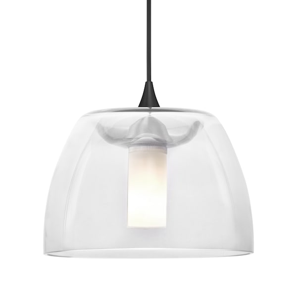 The Spur Clear/Frost is a distinctive double-glass pendant, with an inner frosted cylinder centered within a transparent softly radiused outer glass. The clear blown outer glass complements the soft white Opal cased glass, which can suit any modern decor. The inner tranquil glow is pleasing in appearance, as the sophisticated outer glass sparkles with the accents from that glow. The 12V cord pendant fixture is equipped with a 10ft braided coaxial cord with teflon jacket and a low profile flat monopoint canopy. These stylish and functional luminaries are offered in a beautiful Black finish.