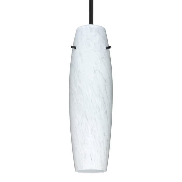 The Suzi is a slender yet shapely handcrafted glass with a open top and bottom. Our Carrera glass is a classic yet modern decor that gives off a soft white light. Clear molten glass is rolled in alabaster powder like frit, and then blown into shape with a semi-clear frosted white inner finish. This decor is created by rolling molten glass in small bits of white called frit. The smooth satin finish on the clear outer layer is a result of an extensive etching process. This blown glass is handcrafted by a skilled artisan, utilizing century-old techniques passed down from generation to generation. Each piece of this decor has its own artistic nature that can be individually appreciated. The stem pendant fixture is equipped with an adjustable telescoping section, 4 connectable stem sections 3in, 6in, 12in, and 18in and low Profile flat monopoint canopy. These stylish and functional luminaries are offered in a beautiful Black finish.
