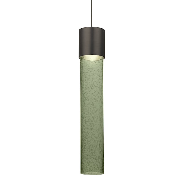 The Wanda 12 LED Pendant is composed of a narrow transparent Moss glass cylinder, with an interesting bubble pattern blown randomly throughout the glass. The pleasing play of light through the bubble accents make for a striking affect, along with the splash of concealed LED downlight makes the Wanda ideal for task oriented applications. The 12V cord pendant fixture is equipped with a 10ft braided coaxial cord with teflon jacket and a low profile flat monopoint canopy. These stylish and functional luminaries are offered in a beautiful brushed Bronze finish.