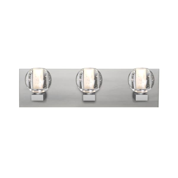 The Boca Vanity is comprised of an appealing globe-shaped clear solid glass with bubbles, accented by an interesting inner frosted tube to diffuse the light source. The splash of concealed LED illumination through the solid glass makes the Boca a stunning display of light refractions. Each globe is cantilevered from the plated rectilinear backplate on a die cast fitter. These stylish and functional luminaries are offered in a beautiful Satin Nickel finish.
