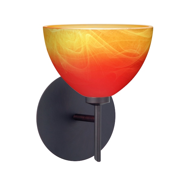 Brella has a classical bell shape that complements aesthetic, while also built for optimal illumination. Our Solare glass is a pressed glass that features swirls of white throughout clear glass, which then is colored with a translucent mix of red-orange to yellow. This décor is classic and can be used in various ways. When lit this gives off a light that is functional and soothing. The smooth satin finish on the clear outer layer is a result of an extensive etching process. This handcrafted glass uses a process where every glass is consistently produced using a press mold, keeping variations to a minimum. The mini sconce is equipped with a decorative lamp holder mounted to either a low profile round or square canopy. These stylish and functional luminaries are offered in a beautiful brushed Bronze finish.