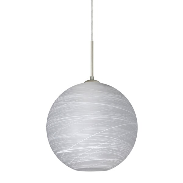 The globe-shaped Coco is a blown glass with a neutral décor and classic shape that blends gracefully into all environments. Our Cocoon glass is a frosted glass with interesting threads of opaque white swirling throughout. This décor is full of textured and creates a point of interest to any room. When lit this glass features a dimensional effect from the whites lines that are interlaced at various levels. The smooth satin finish on the clear outer layer is a result of an extensive etching process, with the texture of the subtle brushing. This blown glass is handcrafted by a skilled artisan, utilizing century-old techniques passed down from generation to generation. Each piece of this décor has its own artistic nature that can be individually appreciated The cord pendant fixture is equipped with a 10' SVT cordset and an low profile flat monopoint canopy. These stylish and functional luminaries are offered in a beautiful Satin Nickel finish.