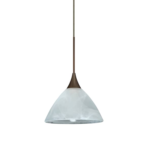 Domi has a classical bell shape that complements aesthetic, while also built for optimal illumination. Our Marble glass is a pressed glass that features swirls of white throughout semi-translucent frost, to create a faux alabaster appearance. When lit this gives off a light that is functional and soothing. The smooth satin finish on the clear outer layer is a result of an extensive etching process. This handcrafted glass uses a process where every glass is consistently produced using a press mold, keeping variations to a minimum. The 12V cord pendant fixture is equipped with a 10' braided coaxial cord with Teflon jacket and a low profile flat monopoint canopy. These stylish and functional luminaries are offered in a beautiful brushed Bronze finish.