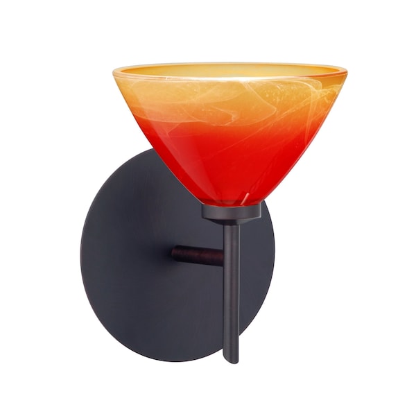 Domi has a classical bell shape that complements aesthetic, while also built for optimal illumination. Our Solare glass is a pressed glass that features swirls of white throughout clear glass, which then is colored with a translucent mix of red-orange to yellow. This décor is classic and can be used in various ways. When lit this gives off a light that is functional and soothing. The smooth satin finish on the clear outer layer is a result of an extensive etching process. This handcrafted glass uses a process where every glass is consistently produced using a press mold, keeping variations to a minimum. The mini sconce is equipped with a decorative lamp holder mounted to either a low profile round or square canopy. These stylish and functional luminaries are offered in a beautiful brushed Bronze finish.