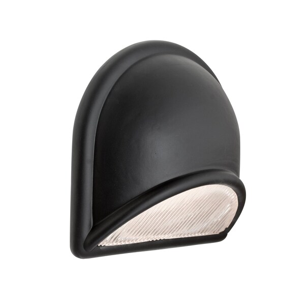 The Gabby outdoor wall sconce is a modern fixture design composed of a black finished mounting bracket and a black painted face, accented by a prismatic bottom diffuser for shielded downlight and clear backing for a glowing halo effect. The contemporary styled "metal" accent actually consists of molded glass with a durable painted finish, which combined with the powder coat, die cast aluminum fitter results in a non-corrosive assembly.